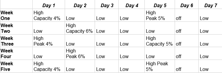 Using these concepts, Clayton built a throwing program that is centered around drop sets aka autoregulation. This basically means that you keep throwing until you drop below that threshold for the day. The example he uses is on a 4% drop-off day for a 100mph thrower; the thrower would keep going until he falls to 96mph. If it takes 5 throws because he is tired, so be it; let him recover. If it takes 25, so be it, maximize the stimulus. In his program, there are no medium days; you either are recovering or sending it. There are also capacity days vs peak days. There is no arbitrary number of sets; the reps are 2-3 throws. Here is a table I made outlining this, copied from the throwing program in the video: